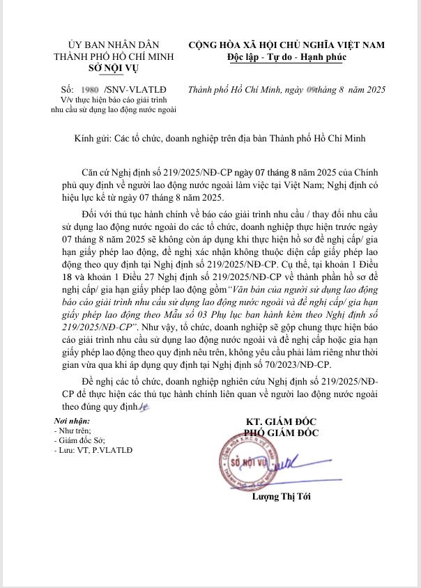 Ngày 9/8/2025, Sở Nội Vụ Tp. Hồ Chí Minh đã ban hành Công văn số 1980/SNV-VLATLĐ về việc thực hiện báo cáo giải trình